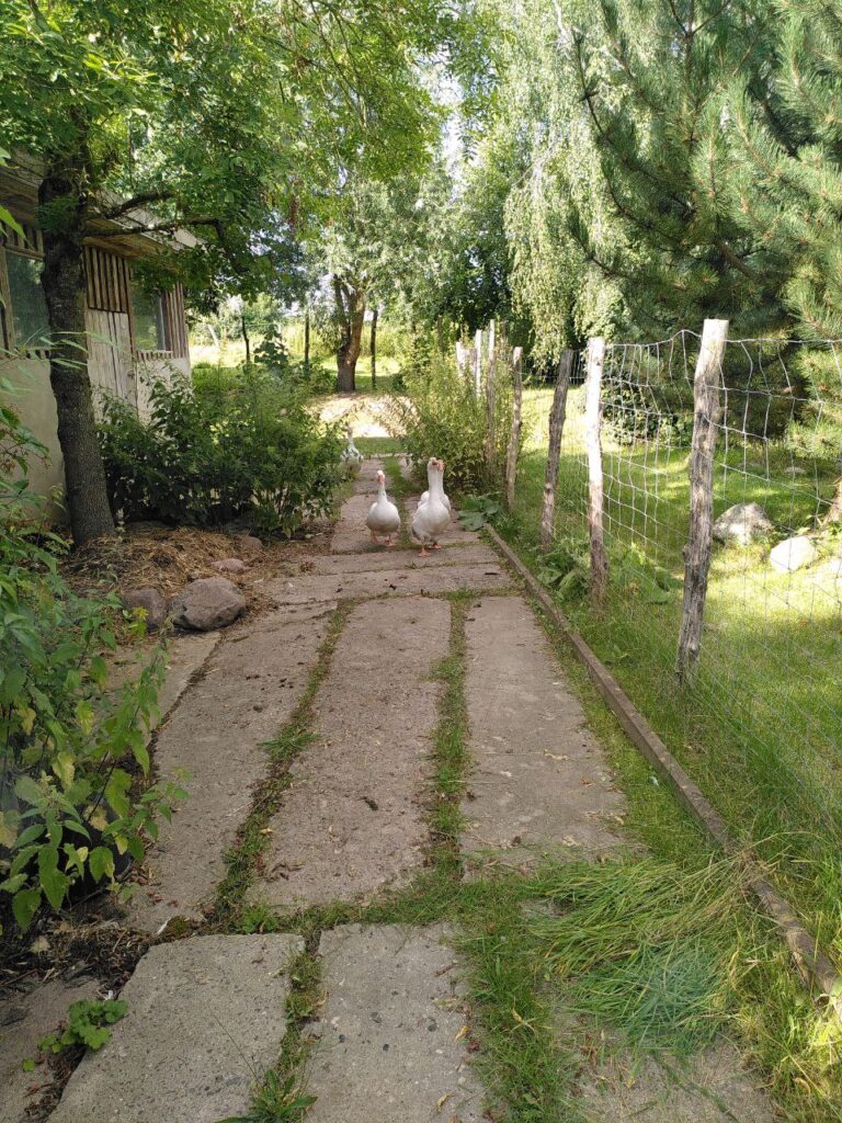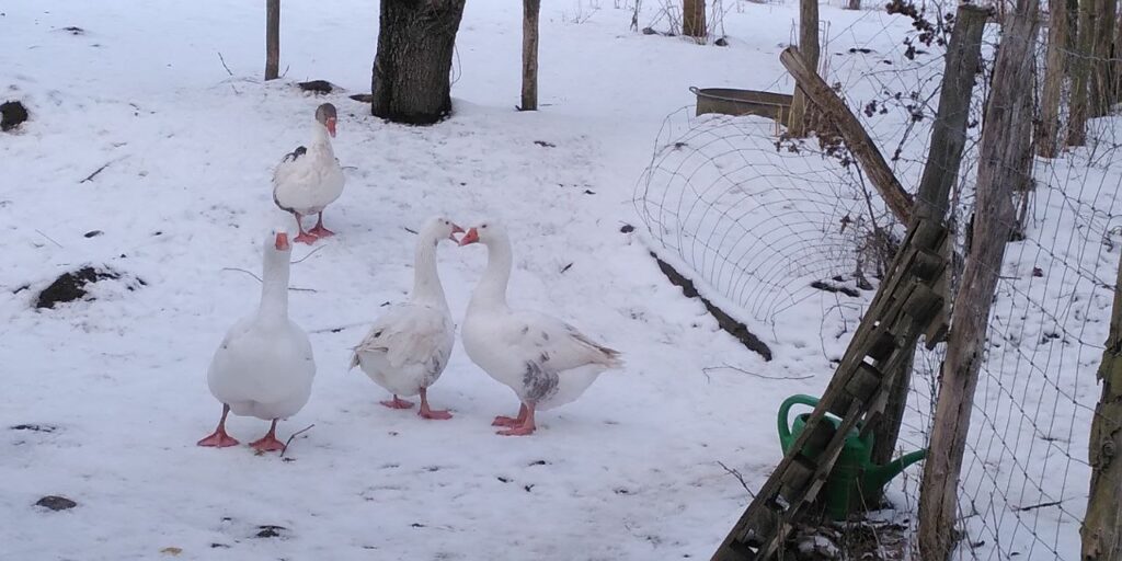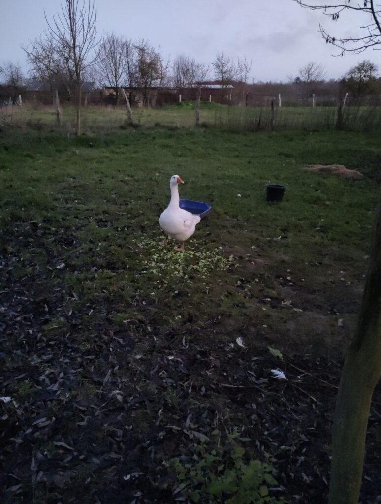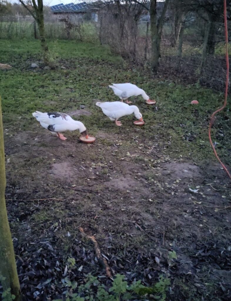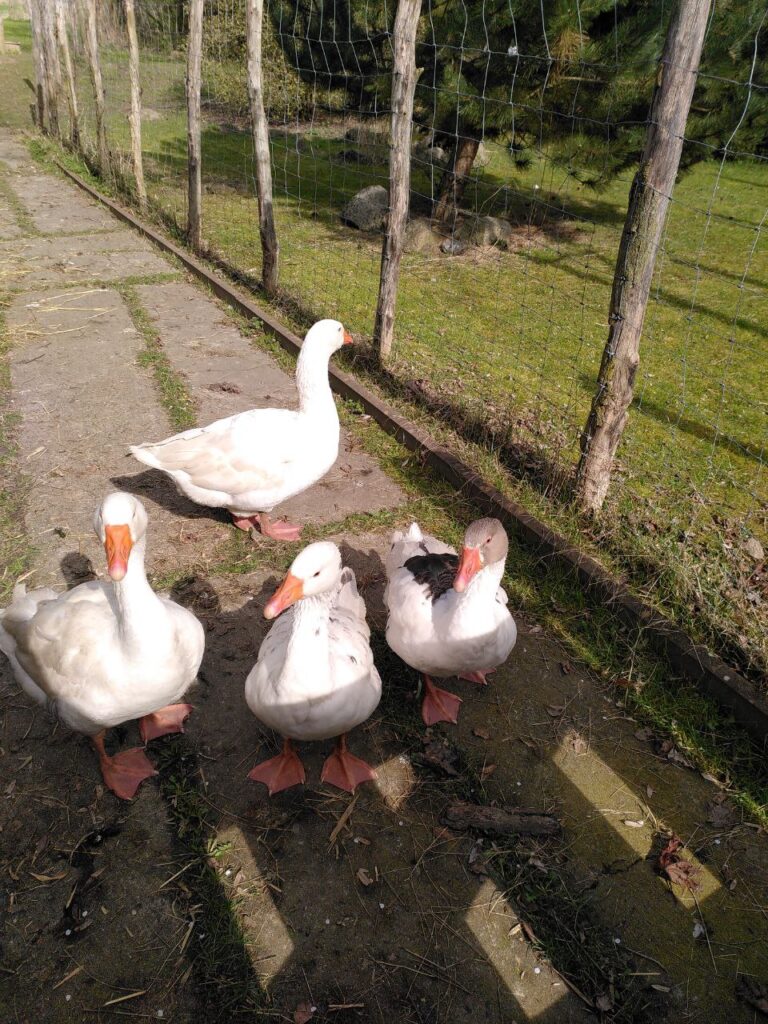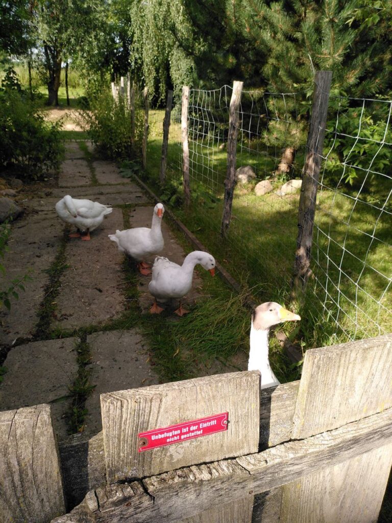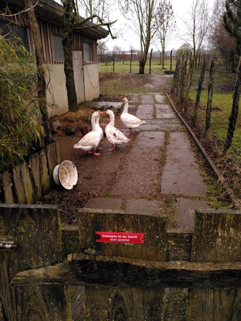 Auf unserem Hof leben vier Ganter. Sie waren schon lange vor uns da und wir wissen gar nicht genau, wie alt sie sind. Unser grau-weißer Ganter Gerd ist ein ganz besonderer. Von den anderen wird er öfter ein wenig geärgert. Die drei anderen kann man nicht so gut auseinander halten. Wir haben sie Giselher, Gunther und Gernot getauft. Die Vier machen gerne viel Geschrei wenn jemand vorbei läuft und können auch fauchen. So furchteinflößend wie sie denken zu sein sind sie allerdings nicht.